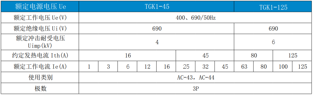 TGK1 系列控制與保護(hù)開關(guān)電器(CPS)( 以下簡稱“開關(guān)”),主要適用于交流50Hz(或60Hz)、額定工作電壓690V、額定工作電流 1A 至 125A、控制器整定電流 0.4A 至 125A、控制電機功率 0.12kW至 55kW 的電路中,能夠接通、承載和分?jǐn)嗾l件下 ( 包括規(guī)定的過載條件 ) 的電流,也能接通、承載一定時間和分?jǐn)嘁?guī)定的非正常條件下 ( 如短路 ) 的電流。