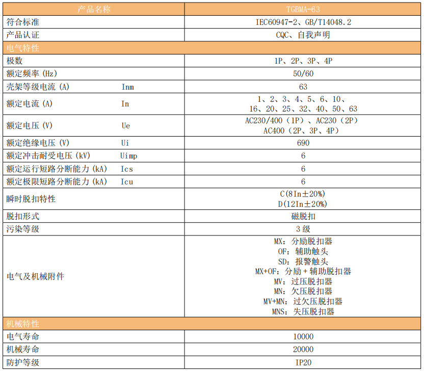 TGBMA-63 單磁式斷路器 ( 以下簡稱斷路器 ) 主要適用于交流 50Hz/60Hz,額定電流1A至63A,額定電壓230V或400V的配電網(wǎng)絡(luò)中。適用于醫(yī)療IT配電系統(tǒng)、電機(jī)保護(hù)及建筑消防系統(tǒng)等領(lǐng)域的低壓終端配電,作為短路保護(hù)開關(guān),也可與熱繼電器或電機(jī)啟動(dòng)器配合使用,實(shí)現(xiàn)過載保護(hù)。